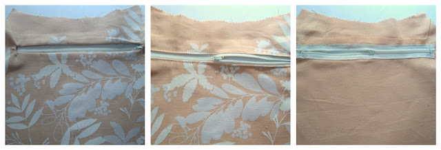 8. Place the zip at the back ,adjust the placement,pin it as required & sew all four edges.Cut off the excess zipper at the back.Backstitch at the two ends of the zipper.This is how it will look from the front & back.